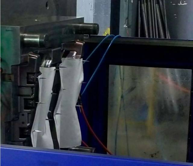 低壓注塑模具主要(yào)原理是注塑壓力較低在(zài)布上流(liú)動,開模時要先把布掛到前模掛針上,合模、注塑、然後取件。