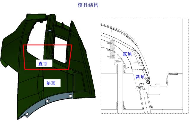 如下圖(tú)所示,產品兩頭采用直頂(dǐng)+斜頂的機構進行脫模。