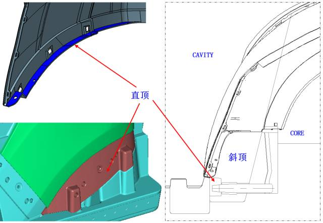 扣位采用在直頂上做隧道彈(dàn)塊的結構進行脫模: