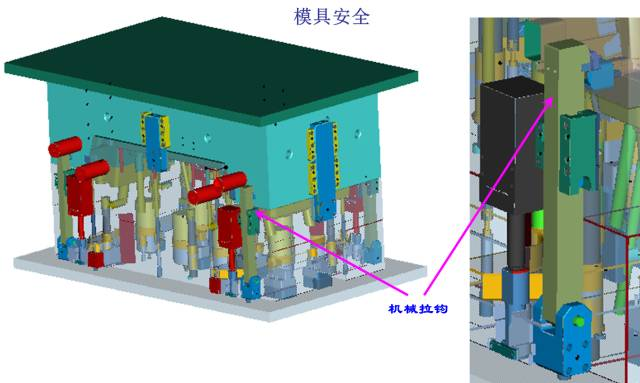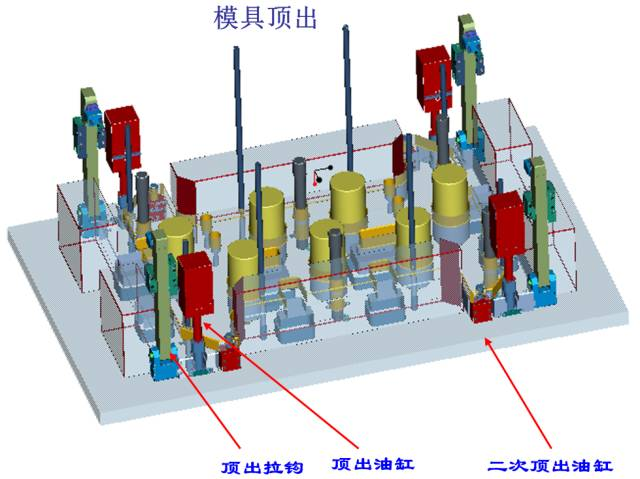 (1)第一級頂出采用(yòng)4個油缸頂出同前模同步運動頂出60MM,4個拉鉤為(wéi)輔助(zhù)機(jī)構;