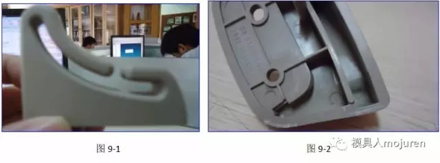在這裏製品仍做了1.2MM的(de)反變形,澆口由(yóu)原來的牛角進膠改為現在的(de)大水口搭底進膠,分流道改為(wéi)了S形,可防止主流道及分流道 的冷料(liào)進入模腔。實際的試模產品如圖9-1、9-2所(suǒ)示,產品無變(biàn)形